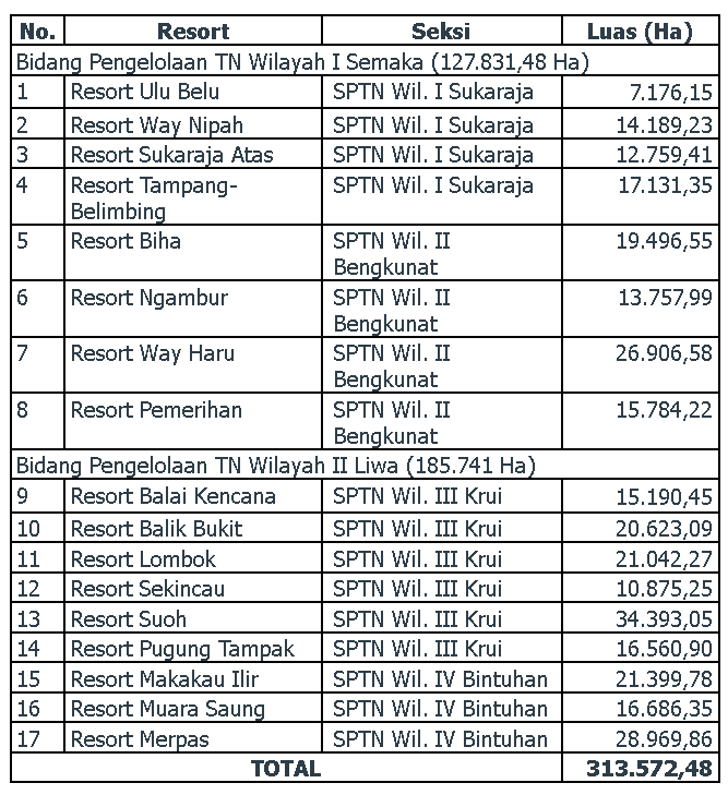 Dalam pengelolaan TNBBS dibagi menjadi 2 (dua) Bidang Pengelolaan Taman Nasional Wilayah (Bidang PTN Wilayah), yaitu BPTN Wilayah I Semaka di Sukaraja Atas, BPTN Wilayah II Liwa di Liwa, dan 4 (empat) Seksi Pengelolaan Taman Nasional Wilayah (SPTN Wilayah) yaitu SPTN Wilayah I Sukaraja di Sukaraja, SPTN Wilayah II Bengkunat di Bengkunat, SPTN III Krui di Krui, dan SPTN Wilayah IV Bintuhan di Bintuhan serta dibagi dalam unit terkecil 17 (tujuh belas) resort Pengelolaan Taman Nasional Wilayah dengan tugas dan fungsi melindungi dan mengamankan seluruh kawasan TNBBS dalam mewujudkan pelestarian sumberdaya alam menuju pemanfaatan yang berkelanjutan. Ketujuh belas resort tersebut meliputi Ulu Belu Resort Sukaraja Atas, Resort Way Nipah, Resort Tampang, Resort Way Haru, Resort Pemerihan, Resort Ngambur, Resort Biha, Resort Balai Kencana, Resort Pugung Tampak, Resort Merpas, Resort Muara Sahung, Resort Makakau Ilir, Resort Lombok, Resort Balik Bukit, Resort Sekincau, Resort Suoh. Secara lebih rinci dapat dilihat pada tabel berikut :